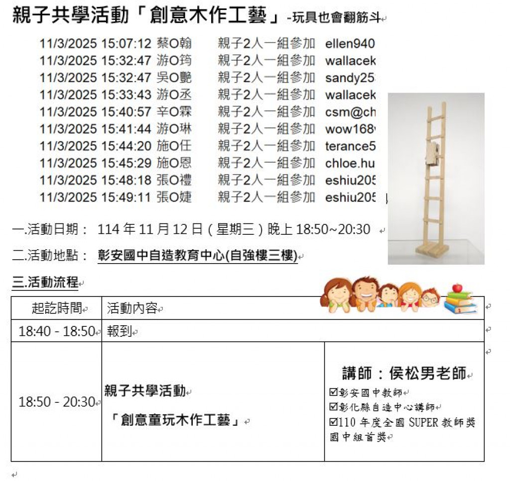 11/12晚上彰安國中創意木工手作親子活動錄取名單公告!