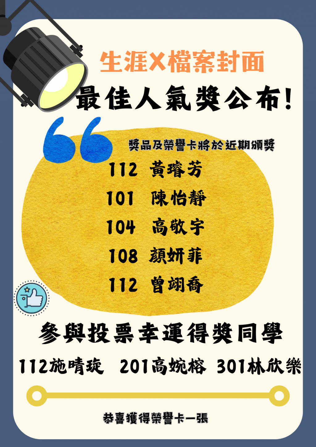 以下五位同學獲得最佳人氣獎 112 黃璿芳 101 陳怡靜 104 高敬宇 108 顏妍菲 112 曾翊喬