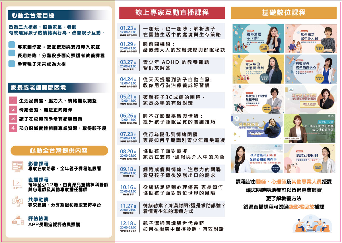 本會辦理「離島偏鄉情緒行為發展弱勢兒童數位家庭賦能計畫-心動全台灣」(方案推展期間:115/1/1-115/12/31),旨在提升離島及非六都地區之資源不足地區,協助照顧者透過專業親職賦能數位課程,提升照護注意力不足過動疾患(ADHD)等情緒行為發展弱勢兒童的能力,敬請貴單位協助公告並轉介符合需求之家長、照顧者、及教師等專業人員參與,讓有興趣參與之照顧者及專業人員更了解此方案之課程內容與進行方式,請查照。 |