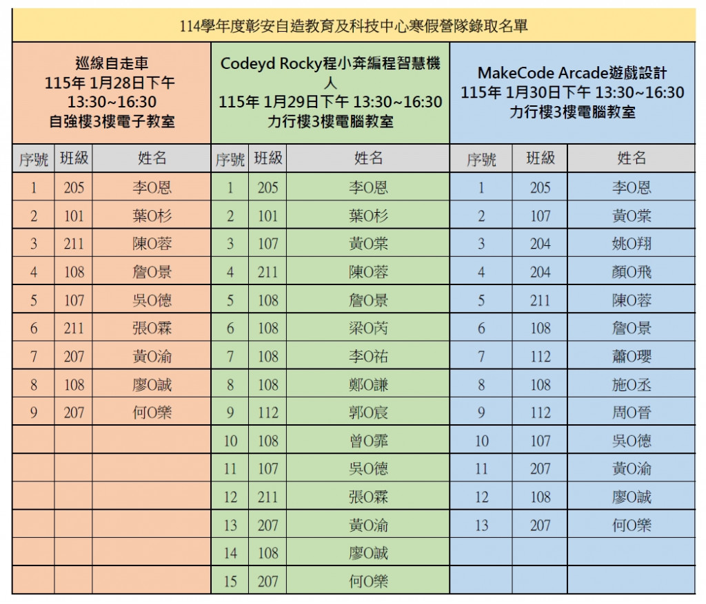 彰化縣114學年度彰安國中自造教育及科技中心寒假營隊錄取名單