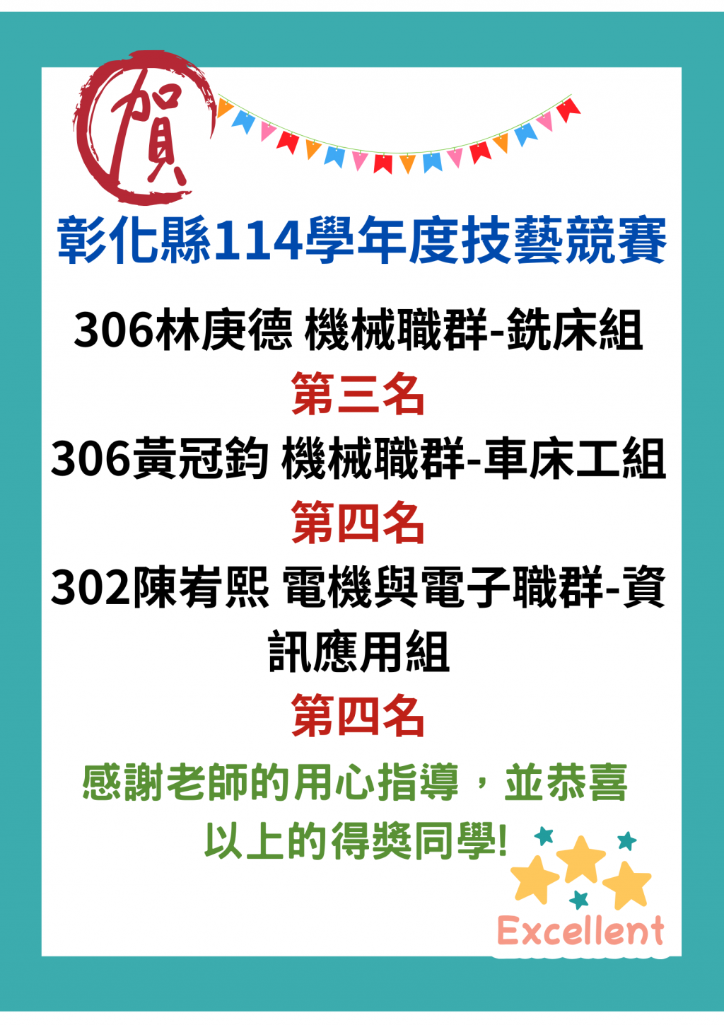 恭賀本校同學於彰化縣114學年度技藝競賽榮獲佳績